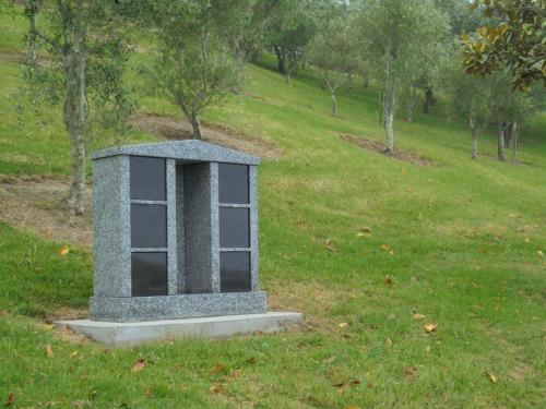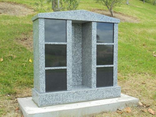 The columbarium is constructed of elegant Grey and black granite with six double ash niches. The family name can be inscribed along the top panel. The black granite niche frontages can be inscribed with your loved ones details. A space is provided for flower vase or incense burner.
